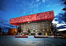 Rockheim is housed in a 1919 grain warehouse in Trondheim. To roughly double the space available, a new sixth floor was added in the form of a cantilevered 'box', which is clad in glass decorated with reproductions of album covers and with changeable back-lighting provided by 13,000 individually controllable LEDs; the public can affect the colours by using cellphones.[2][7][8] A "black box" building for performances was also added; the design envisaged this being covered by climbing plants.[8] The architects for the conversion were Pir II[9] and for the grounds, Agraff AS. The conversion was awarded the City of Trondheim's 2010 building award.[10] The building has 400 square metres (4,300 sq ft) of floor space, of which half is exhibit space. The building and installations cost 300 million kroner.