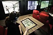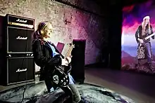 The primary mission of the museum is to preserve and document Norwegian popular music. The permanent exhibit, for which the lead designer was Canadian Stacey Spiegel,[2] takes the form of a journey through Norwegian music and cultural history from the 1950s to the present. It occupies 320 square metres (3,400 sq ft) in the building's top-floor box, and devotes a room to each decade. The exhibition has many interactive components. Visitors first encounter an interactive map of Norway, can select the videos shown in each room, and there are three discovery rooms: in the Ronni Room they can try playing guitar with guidance from Ronni Le Tekrø, and in the Hiphop Room they can experiment with DJing, graffiti art and breakdancing. In Virtuelle Rockheim, launched on 21 August 2009, they can manipulate an avatar to explore a selection of the exhibits in 3D. Spiegel, who also designed the virtual museum, predicted in 2008 that Rockheim would be "the world's most technically sophisticated virtual museum";[13] it was Norway's first online museum.[3]