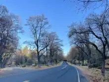 Within the neighborhood is the Rockwood Historic District, which is listed on the National Register of Historic Places. The district is about two blocks wide between Hatch and Arthur streets from 29th Avenue on the south to 14th Avenue on the north, from which it continues turns to the northwest and continues to the northwesternmost corner of the neighborhood.[2] This area of the neighborhood was designed by noted landscape architects, the Olmsted Brothers.[3] It features streets that curve around exposed basalt outcroppings and through old ponderosa pine and Douglas fir forest as they wind their way up the hill from downtown. The Olmsteds were fond of diagonal streets such as Southeast Boulevard that borders the neighborhood. The Rockwood neighborhood borders two of the city's larger parks, Manito Park to the west and Lincoln Park to the east, but does not contain any true parks within its boundaries.[4] However, in the Rockwood Historic Districts, four small grassy islands are located on Garfield Road and Rockwood Boulevard, known as the Olmsted Triangle Parks, as well as a pair of grassy boulevards that intersect at the intersection of Upper Terrace Road and Rockwood and Highland Boulevards.[5][6] The neighborhood's terrain is reflected in many of the street names, like the aforementioned Rockwood, Highland and Upper Terrace, as well as Crest Road and Overbluff Drive.[7]