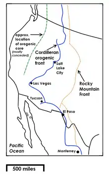 The Rocky Mountain Front in Montana from the Canada–US border south to about Helena is heavily deformed by faulting, folding, and overthrusting.[16] During the Sevier orogeny mountain-building event about 115 and 55 million years ago, what is known as the Cordilleran foreland thrust-and-fold event occurred along the east side of the Rocky Mountains in northwest Montana. The thrust-and-fold belt does not extend all the way south through Montana. Instead, it cuts west above Three Forks continues south—crossing the Snake River Plain and skirting the west side of the Colorado Plateau before cutting west again to enter California. Although most of this mountain-building has since been obliterated by additional orogeny and volcanic activity, most of it still exists in northwestern Montana.[17] The Rocky Mountain Front in this area represents some of the highest changes of elevation within a short distance anywhere in North America. Much of this part of the front, including the Lewis Range and Livingston Range, has suffered heavy glaciation.[18]