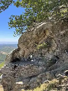 Upturned beds of Briones Formation sandstone that comprise the crest of the ridge are very fossiliferous and many species of ancient marine sea creatures can be seen,[6][9] as the seafloor where they were deposited is now thrown up into steep rock outcrops nearly 2000' above sea level.