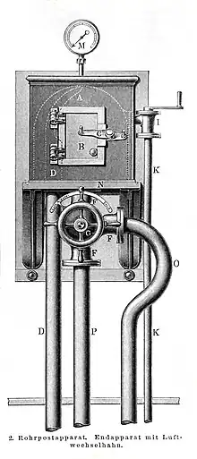 The Rohrpost (German: [ˈʁoːɐ̯ˌpɔst] ⓘ) in Berlin, was a pneumatic tube postal service, which existed from 18 November 1865 until 1963 in West Berlin and in East Berlin until 1976.