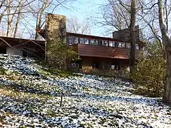 Roland Reisley House was built in Pleasantville, New York in 1951. The third of the "Usonia Homes" (now known as the Usonia Historic District) designed by Frank Lloyd Wright. this is a building on a hillside with a masonry "core" and wood siding. Roland Reisley was 26 when he built his home. The entrance is dominated by a dramatic wood cantilevered carport, which leads to an impressive yet unpresumptuous low-slung house with cypress paneling and indigenous stone.