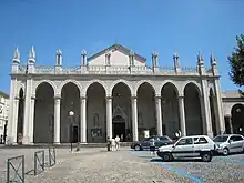 Among the religious edifices of the city of Biella, the most notable is the Gothic cathedral, built in 1402.[4] Its beautiful choir is by Galliari. The baptistery, in the form of a small temple, is said to be an ancient Roman edifice. It is in fact a work of the eleventh century, erected on the site of a Roman tomb.[5]