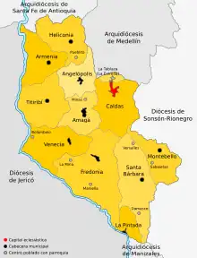 The Diocese of Caldas (Latin: Caldensis) is a Latin Church ecclesiastical territory or diocese in Colombia. The episcopal see is the city of Caldas. The Diocese of Caldas is a suffragan diocese in the ecclesiastical province of the metropolitan Archdiocese of Medellín. The Bishop of the Diocese of Caldas is Juan Fernando Franco Sánchez.