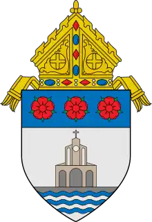 Former coat of arms of the Diocese of Dipolog used until 2014. The three roses symbolize the patroness of the diocese, and the cathedral above wavy lines connotes the origin of the name Dipolog (across the river).