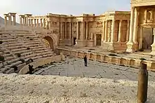 The Roman Theatre at Palmyra (Arabic: مسرح تدمر, romanized: Masraḥ Tadmur, lit. 'Palmyra Theatre') is a Roman theatre in ancient Palmyra in the Syrian Desert. The unfinished theatre dates back to the second-century CE Severan period.[1] The theatre's remains have since been restored. It was occupied by the Islamic State of Iraq and the Levant (ISIL) in May 2015 and recaptured by the government forces in March 2016 with the support of Russian airstrikes.