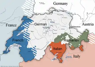 Language map of Switzerland, with regions speaking French (Romandy) in blue and Romansh in green