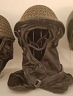 The second and more numerous variant is Model 2. The shell of Model 2 is an M73 shell cut down to the inner lining fixing rivets, with an attached leather ear and neck guard replacing the four-point chin strap.[lower-alpha 1] For added shock-absorbing the helmet has additional padding along the periphery of the helmet and on the sides of the ear guards, are cups designed for the use of headphones. Model 2 comes in two different liners, one is almost identical to the standard M73 liner with the four leather tongues being slightly smaller, and the other is an 8-tongued liner (both liners were produced with or without ventilation holes).Most M73 airborne helmets feature camouflage netting but are often used without.[11]