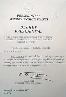 Even after the protest of Timișoara began, on December 19, 1989, Teoctist sent a telegram to Ceaușescu, congratulating him on his re-election as General Secretary of the Communist Party and praising him for his "brilliant activity", "wise guidance" and "daring thinking",[19] hailing the "golden age" bearing Ceaușescu's name.[20]