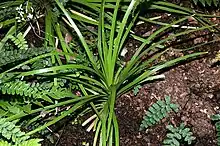 It is a small, hard-leaved lily-like plant that forms in tufts or in clumps, atop stilt-like roots. Its foliage grows up to approximately 15 cm (5.9 in) tall and has long, narrow leaves that are 6 to 12 cm (2.4 to 4.7 in) long and only 3–4 mm (0.12–0.16 in) wide. Its flower stalks are up to approximately 20 cm (7.9 in) tall, carrying clusters of the white flowers, their petals and sepals similar in appearance and 3–4 mm (0.12–0.16 in) long.[4]