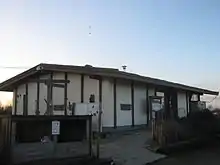 The main visitor centre was designed by the Baker-Brown McKay Partnership. The techniques and materials used mean the building has a life span of at least 100 years. The foundations are steel gabions filled with cobblestones from Lydd, these have been handpicked and filled. The main framework of the building is made of larch, from the West Country. This part was built first so that the roof could be added next, and so a cover was provided for the straw during the next building process. 350 straw bales were placed to form the walls, held together with chestnut poles. Even the roof has been designed with wildlife in mind, as it is covered in sedum as a green roof. The roof covers the building's entire footprint, replacing the habitat which would have otherwise been lost.[9] The building was 'Highly Commended' at the 2003 Kent Design Awards.[10]