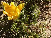 Romulea tortuosa is a very low perennial plant of 3–6 cm (1.2–2.4 in) high, that survives the dry southern summer through storage of its resources in an oval corm, which is clad in a brown, rigid tunic. Its three to four spreading, firm, awl-shaped basal leaves are coiled like corkscrews, 3¾–5 cm (1½–2 in) long, about 1 mm (0.04 in) in diameter, with three veins.[2][3] Two or three flowers appear almost without a stem from the base of the leaves. Each flower is subtended by two green lanceolate non-coiling bracts of 1¼ cm (½ in) long. The bright yellow perianth, that consists of six tepals, which are merged near their base, forms a short tube at its base, and a cup of 1¼ cm (½ in) high, with egg-shaped lobes. The anthers are in the upper half of the cup and narrowly arrow-shaped.[4] The typical subspecies (R. tortuosa subsp. tortuosa) has brown blotches near the bottom of the flower cup, which are absent in R. tortuosa subsp. aurea.[3] The opened flower smells like the Narcissus blossom.[2][5]