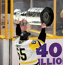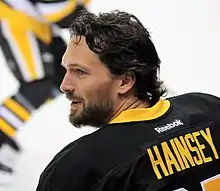 On February 23, 2017, Hainsey, in the final year of his contract, was traded to the Pittsburgh Penguins in exchange for a second-round pick in the 2017 NHL Entry Draft and Danny Kristo.[16] It was the first time that he had been traded in his career.[17] It was with the Penguins that on April 12, 2017, after 907 career NHL games and surpassing Olli Jokinen's previous playoff games drought "record", Hainsey made his Stanley Cup playoff debut, doing so against the Columbus Blue Jackets.[1] Hainsey and the Penguins went on to win the Stanley Cup over the Nashville Predators in the Finals. He was the first player captain Sidney Crosby handed the trophy to, following the victory.[18]