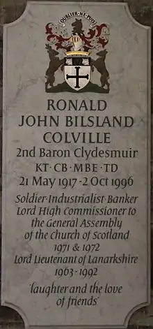 Ronald John Bilsland Colville, 2nd Baron Clydesmuir, KT, CB, MBE, TD (21 May 1917 – 2 October 1996), was a Scottish soldier and businessman.[1] He notably served as Governor of the Bank of Scotland, Lord Lieutenant of Lanarkshire, and Captain General of the Queen's Bodyguard in Scotland. According to his obituary, he was described as "an outstanding and dedicated servant of Scotland. He was a gentleman of the old school with a genial wit and great generosity of spirit".[2]