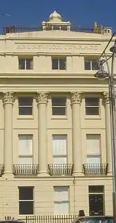 Brunswick Terrace, built in four parts facing the English Channel coast on Hove seafront, was part of the Brunswick estate development laid out at the extreme east end of Hove following the rapid growth of neighbouring Brighton in the early 19th century, and particularly in response to Kemp Town. Although within the parish of Hove, it was closer to the boundary of Brighton and was considered part of the latter.[1] The estate was laid out by Amon Henry Wilds and Charles Busby between 1824 and 1828.[2] The terrace, described as an "elegant Regency block",[3] has Grade I listed status.[4]