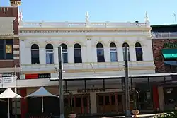 The Rooney Building, constructed in 1883, has a plain symmetrical facade with some classical features such as arched windows and a decorative parapet which conceals the corrugated iron roof. The ground floor facade of this cement-rendered brick building has been altered and the original awning replaced with one of a modern cantilever design. This floor is now divided into three shops. Aluminium windows have replaced the timber framed windows on the upper level while the interior of the first floor has been renovated to house offices.[1]