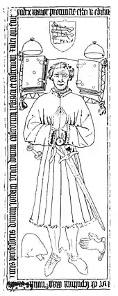 Jordanus Bricius, whose name is usual written in French as Jourdain Brice, was an important judge and legal scholar. He is believed to have died in either 1433 or 1439.[45][46] The historian Eugène Germer-Durand when reporting the discovery of the slab suggested that his family name may have been Brès which in the Provençal dialect is similar to the word for a type of trap used to catch birds.[47] This could explain the crest on the slab which includes a small bird above three objects that could be traps. Jourdain Brès may have been born locally as the family name of Brès existed in the neighbouring village of Laudun in the 17th century.[42]
