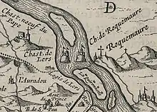 In 1590-1591 during the French Wars of Religion the castle came under siege and parts of towers and walls were destroyed.[20] Subsequently, Louis XIV failed to maintain the building and it fell into a state of disrepair. At the beginning of the 18th century the arm of the Rhône flowing between the castle and the right bank silted up so that instead of sitting on an island the castle now stood on the bank of the river near the town.[21] After the revolution the ruined castle was sold off in lots and used as a source of stone for other buildings.[22]