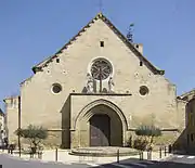 The Catholic collegiate church of Saint-Jean-Baptiste and Saint-Jean-l'Evangéliste dates from the first half of the 14th century. It was built in the southern gothic style (gothique méridional) and replaced an earlier church dedicated to Sainte-Marie.[37][lower-alpha 3] The construction of the present church was initiated by Bertrand du Pouget, a powerful figure in the church hierarchy in the early period of the Avignon Papacy. He was appointed as the cardinal priest of San Marcello by Pope Jean XXII in 1316 and the cardinal bishop of Ostia e Velletri in 1327.[38][39] In 1345 Pope Clement VI authorised the transfer of the parish services from Sainte-Marie to the new church and the establishment of a collegiate chapter consisting of ten priests and two canons. One of the canons was charged with the spiritual care of the congregation. The chapter was relatively wealthy as it inherited the benefices of the earlier church and gained addition endowments from the founder.[40]