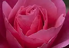 The cultivar grows shoots up to 120 centimetres (47 in) high with medium-sized very double flowers that are pink to pink red and have a very strong fragrance.[5] The rose flowers repeatedly beginning in May or June.[3] The rose grows one to four flowers per stem that are 9 to 10 centimetres (3.5 to 3.9 in) in diameter.[1] The bloom has been described as pink, dark pink, or fuchsia-colored in the style of old roses or resembling a peony.[2][4] The petals are firm, which allows the flower to stay in shape in rain, the inner petals are sometimes whirled or quartered, and petals often have a thin light border and are sometimes crenated.[2] The shrub is very thorny, branches only below flowers, and has large green to dark green foliage.[1][5] Its habit is upright and bushy.[6]