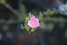Rosa stellata is a species of rose known by the common names desert rose,[1] gooseberry rose, and star rose. In Texas this type of rose grows on dry rocky places to 6,500 feet (2,000 m), such as the Trans-Pecos. It occurs in the mountain canyons of Arizona and New Mexico. It also grows in dry, rocky places.[2] It has trifoliate leaves, deep rose purple blossoms and yellowish white prickles on the petioles and stems. It is a perennial shrub with velvety, deciduous leaves.[2] Some horticulturists consider it to be a browse plant.[3]