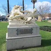 This small garden contains an imposing statue of George Lansell with a large piece of quartz held in his hand. The statue is shown right: the inscription at the base reads "In appreciation of the indomitable courage and persistent enterprise of George Lansell in the development of Bendigo's gold resources. This memorial was erected by the citizens of Bendigo. 1823 – 1906."