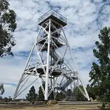 The lookout, situated at the top of Camp Hill, was originally a poppet head from the Garden Gully United mine (one of Bendigo's richest mines) and was installed in its current location in 1931.[3] During goldrush times, prior to the poppet head's installation, a flag was flown at the top of Camp Hill to signal that the mail had arrived in town. At this time Camp Hill was completely denuded of trees and the flag could effectively be seen from across the town.[3]