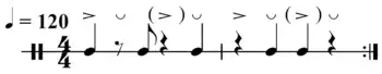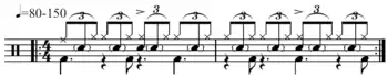 The Rosanna shuffle is the drum pattern from the Grammy Award winning Toto hit "Rosanna". It is known as a "half-time shuffle" and shows "definite jazz influence".[4] It features ghost notes and is derived from the combination of what Jeff Porcaro, who plays on the song's recording, calls the "Bernard Purdie half time shuffle" (Purdie shuffle) and the "John Bonham beat" (from "Fool in the Rain") with the well-known Bo Diddley beat.[1] The pattern is notoriously difficult.