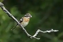 Maximum lifespan recorded for a wild rose-breasted grosbeak was 12 years, 11 months.[35] Captive grosbeaks have been recorded living up to 24 years of age, making them quite a long-living passerine excluding the pressures of surviving in the wild.[36] Although frequently targeted by the brood parasite, the brown-headed cowbird (Molothrus ater), the rose-breasted grosbeak is apparently able to recognize cowbird eggs and has been seen to aggressively displace cowbirds near the nest.[37] Typically, fewer than 7% of grosbeak nests have cowbird eggs per one study.[38] Per the U.S. Bird Banding Laboratory, as of 1997, rose-breasted grosbeaks recovered when dead have largely collided with objects, including buildings and cars (17.2%) or had been shot (10%; mostly before 1960), 3.6% of the fatalities were caught by cats, 0.8% caught by dogs. Mortality due to natural causes, including disease, natural predators and inclement weather go largely unreported.[39] It is known the main cause of nesting failure is predation. Natural predators of eggs and nestlings include blue jays (Cyanocitta cristata), common grackles (Quiscalus quiscula), raccoons (Procyon lotor), gray (Sciurus carolinensis) and red (Tamiasciurus hudsonicus) squirrels.[39][40] Confirmed predators of adults include both Cooper's (Accipiter cooperii)[41] and sharp-shinned hawks (Accipiter striatus)[42] as well as northern harriers (Circus cyaenus),[43] eastern screech-owls (Megascops asio)[44] and short-eared owls (Asio flammeus).[45]