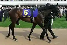 - ↑ @Versailles_Farm (October 19, 2018). "頭を強く打ったせいか、すこし体が不自由になってしまっており、種付けすることができないのではないかと言う現場の判断があったようで、ブリーダーズスタリオンさんから近い、当牧場にお願いしたいとの事でしたので、飼養管理させて頂くことになりました🐴種牡馬としては引退となっております。" (Tweet) (in Japanese). Retrieved 2023-01-04 – via Twitter.