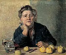 Mead returned to Bury St Edmunds in 1897, never- except for the rare holiday- to leave again. In the same year Cuisine en Boheme was shown at the Royal Academy summer exhibition. Two paintings Friday Morning at St Mary's and My Mother were shown in the 1899 exhibition.[1] Rose Mead nursed her mother until her death in 1919, whilst earning a living painting portraits, mainly commissioned by local dignitaries.[1][4] In 1929 she visited Newlyn in Cornwall, visiting the existing Newlyn School of artists of that time. One figure study titled Painted in Dod Procter's studio in Newlyn is a known result of the visit.