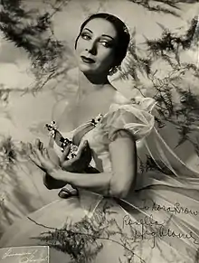 She joined the de Basil Ballet in 1946, which was performing under the name Original Ballet Russe. Hightower received acclaim from John Martin of The New York Times after a March 1947 performance of Giselle by the Original Ballet Russe at the Metropolitan Opera House. After Alicia Markova, who had been scheduled to dance the title role, became sick, Hightower was called in as her replacement, and learned the part she had never danced before in some five hours of rehearsal with dancer/choreographer Anton Dolin. Martin's review stated that the "Original Ballet Russe had planned no novelty for the opening of its season... but there was a major one on its program nevertheless. This was the unscheduled first appearance of Rosella Hightower in the title role of Giselle", calling it "a thoroughly admirable achievement, which brought an ovation from the audience".[3] Three days later, Martin's review of Swan Lake called Hightower "the newest star on the ballet horizon" after her two performances with Dolin and then André Eglevsky as her partner[4]