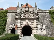 Although the defense of Kronach was successful, its siege demonstrated that the town and fortress' defenses were insufficient in the face of new military developments. After the Swedes were no longer an imminent threat, renovations started, overseen by Prince-Bishop Philipp Valentin Voit von Rieneck. Starting in the second half of the 17th century, the existing bastions were replaced with five baroque stone bastions, and a system of four ravelins was built at the north end of the fortress.[9] Additional earthworks and adits were also constructed north of the bastions.[1][10]