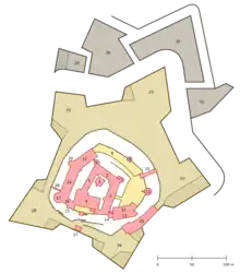 After the war ended, it was decided that the fortress was insufficiently fortified, so Prince-Bishop Veit von Würzburg oversaw the construction of a third layer of fortification consisting of four mostly wood and earth bastions.[6][7] Veit also had a renaissance-style palace built inside the castle, with the hope that Kronach could become the Prince-Bishopric's third residence city, after Bamberg and Forchheim. This hope never materialized, however, starting in the early 17th century, Kronach became the refuge of choice for the Prince-Bishops, their treasures, and their archives at times when Bamberg was threatened by war. Christoph Franz von Buseck, the last Prince-Bishop of Bamberg, sought refuge at Kronach before his final deposition in 1802.