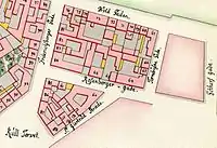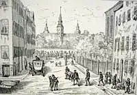 A boarding house known as Pjaltenborg, which provided accommodation for the very poorest part of the city's population, was located on the corner with Aabenraa. The cheapest option in the immensely crowded building was to spend the night standing along the wall attached to a hook by a rope under the arms. The run-down, half-timbered building was destroyed in a fire on the night between 25 and 26 March 1850.[2]