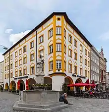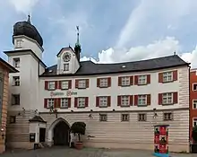 The Mittertor (the sole survivor of five market gates) was the eastern gate of the market town before 1350, which was then protected with a double ditch. Since the 15th century, it separated the interior from the exterior of the market town and served as a customs office. Until the 19th century it also contained several municipal facilities such as the city clerk's office. After the great fire in 1641 the Rosenheim onion dome was built and later extended into a long building. At its core is the Mittertor, the oldest building in the city. On the façade facing the square is the emblem of Louis Rosenheim, with the white rose against a red background. The Bavarian crest can also be seen here.