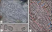 A: R. occultata var. populina, cubic spores B: R. ceranisca, oblong spores; ascus (red line) with only four mature spores visible but remnants of four aborted spores can be seen (arrows) C: R. callibotrys, oblong spores. Scale bar: 10 µm.