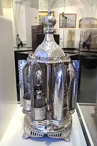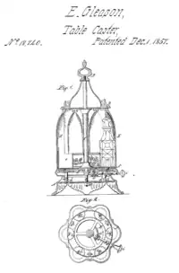 A major factor in Gleason's success was his ability to innovate, catering to a rising middle class clientele with a taste for mechanical gadgetry and the accessories of fine dining. His sons obtained patents for several products, including an ink stand[10] and a cake basket,[11] as well as several variations on the table caster, a device designed to hold condiment containers on the dining table.[12][13] The 1866 product catalog listed more than sixty types of casters. They were very popular items; in 1844, the Boston and Sandwich Glass Company, which made bottles and jars for casters, ordered 150 dozen caster frames.[14] One of the most elaborate casters concealed condiment bottles behind revolving doors and was cleverly marketed as the "Magic Caster"; an "improved" version added a bell and an egg stand.[15] Catherine Lanford Joy writes, "With its combination of mechanical ingenuity, artistic design, and mysterious effect, Gleason's Magic Caster is quintessentially Victorian."[16]
