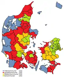 The Rotten Banana (Danish: Den rådne banan) is an informal area of rural Denmark facing significant economic disparities.[1] The term Rotten Banana traditionally includes an area of Danish municipalities the west coast of Jutland to Lolland-Falster islands in the southeast,[2] forming a crescent shape reminiscent of a curved banana. This phenomenon has garnered media attention due to the stark economic disparities between these regions and more prosperous urban centers,[3][1] like Copenhagen, Aarhus, and Odense.