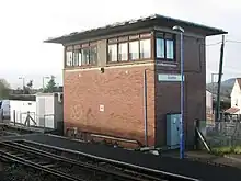 A signal box was built in 1875 at the Exeter end of the station on the south side of the line. This was replaced by a new building on 16 June 1957 which was on the opposite side of the tracks. On 11 June 1967 the line from Chard Junction to Pinhoe was reduced to a single track[17] but a loop line was retained at Honiton to allow trains to pass midway on this 29 miles (47 km) section. The westbound platform was signalled to allow eastbound trains to use it when they are not crossing a train coming in the opposite direction. In December 2009 a new loop was installed at Axminster to break up the section towards Chard. One siding was retained to the west of the signal box, worked by a ground frame rather than from the signal box itself,[18] however this has now also been lifted.
