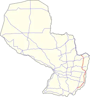 National Route 7 (in Spanish, officially Ruta Nacional Número 7 "José Gaspar Rodríguez de Francia", or simply Ruta Siete) is an important highway of Paraguay. It links the departmental capitals of Caaguazú and Alto Paraná, Coronel Oviedo and Ciudad del Este, respectively. Crossing a total of 10 districts of both departments. It starts on the roundabout of Coronel Oviedo and ends at the Friendship Bridge, on the Paraná River, traversing 193 km (120 mi).