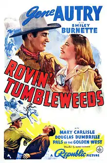 Rovin' Tumbleweeds is a 1939 American Western film directed by George Sherman and starring Gene Autry, Smiley Burnette and Mary Carlisle. Written by Betty Burbridge, Dorrell McGowan, and Stuart E. McGowan, the film is about a cowboy congressman who exposes a crooked politician who is delaying passage of a flood control bill.[2]