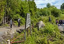 A half-mile (800 m) from the turn to the northwest, the road reaches a cul-de-sac at the Canadian border, 0.6 mi (1 km) from its southern terminus.[22] Large boulders and a gate obstruct vehicular passage, signage indicates in English and French that the road is closed and pedestrian traffic prohibited, and a tall pole with a light and monitoring station used by the U.S. Border Patrol. In the border vista there is a stone obelisk marking the border and a metal strip. Short gravel paths on either side of the barricades cross the border.[1]