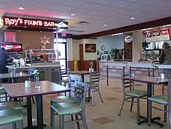 In the cafeteria-style restaurants, customers push their trays on rails past stations stocked with pre-wrapped packages of hamburgers, cheeseburgers, and roast-beef sandwiches. A feature of this chain in any of the locations is the Fixin's Bar which features numerous condiments. Due to this feature, sandwich items are delivered without any of the customary garnishes. After selecting and paying for these items, patrons can garnish them to their own taste at the Fixin's Bar with such items as ketchup, BBQ sauce, mayonnaise, horseradish sauce, lettuce, tomatoes, pickles, and onions. Numerous locations offer hand-dipped milkshakes made with Edy's Ice Cream.