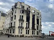 On 15 July 2023, a fire broke out on the fourth floor on the hotel's western side. The East Sussex Fire and Rescue Service arrived at the scene at 5:24pm due to reports of smoke. The Old Steine and interlinking roads were closed with local bus services diverted. Smoke filled the area and by 7:02pm, people were advised to stay away due to health concerns and in case the building collapsed. At 8:30pm, the roof partially collapsed.[18] The fire continued to burn throughout the night. By 1:10pm the next day, the fire had reached the bottom floor. Concerns over asbestos being released were raised as the hotel collapsed.[19] By 11:00am on 17 July, demolition crews had arrived, but were stopped due to complaints from a heritage group about preserving the Grade II listed façade. At 5:40pm, the Old Steine was reopened.[20] Demolition of the gutted western side began on 19 July 2023,[1] estimated to take two to three weeks to complete, but stopped two days later when more smoke was seen.[21] The A259 road, which runs in front of the hotel, was closed for six weeks. Repairs and further demolition were still ongoing at the end of August 2023.[22] In October 2023, the East Sussex Fire and Rescue Service said that the fire was likely caused by a discarded cigarette.[23]