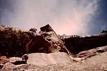 The Royal Arches Route is a big wall climbing route in California's Yosemite Valley on the Royal Arches wall. The route is recognized in the historic climbing text Fifty Classic Climbs of North America.[1] The route was first climbed Oct. 1936 by Ken Adam, Morgan Harris, K. Kenneth Davis.[2] The route is moderate in difficulty and is frequently climbed. The first 4 pitches are along a west-facing dihedral. At Pitch 5, the route turns north and ascends the main face along crack systems. Pitch 10 can be free climbed at 5.10b however, most climbers use a fixed rope to pendulum to a long ledge. At the end of Pitch 15, begins the bolted rappel route. It is 18 rappels to the Valley floor.[2] Some climbers prefer to continue to "The Jungle" at the end of Pitch 16. Beyond The Jungle is a 5.4 slab and 4th Class scrambling to the Valley Rim. The descent is usually accomplished by traversing northeast to Washington Column and descending the exposed North Dome Gully.