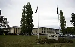 Planning for the mint started in 1959 when it was proposed to move the Melbourne branch of the Royal Mint to Canberra, with a large site in the Canberra suburb of Deakin chosen. The Chief Designing Architect in the Commonwealth Department of Works, Richard Ure, was responsible for the International style design of the mint. It was officially opened by The Duke of Edinburgh on 22 February 1965, coinciding with the introduction of the Australian decimal currency on 14 February 1966.[2] The mint project cost £4.5 million, with Prime Minister Harold Holt noting at the official opening: "We believe that, not only have we achieved a gracious and dignified building in a national setting, but we have a mint also which incorporates the best equipment and most modern minting techniques."[3] The main administration building was constructed by Civil and Civic, while the process building was completed by E. S. Clementson Pty Ltd.[4]