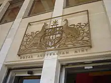 The gold coat of arms of Australia is featured above the entrance to the Royal Australian Mint. It was produced by E. S. Clementson Pty Ltd for £500.[1]