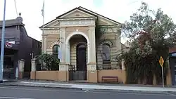 The rendered masonry front fence forms a plinth to the building which is set back from the property boundary and raised above street level. The compact front elevation is dominated by a projecting pedimented portico which is framed by fluted corner pilasters and shelters a set of concrete stairs and a landing. The plain moulded pediments of the front elevation and portico rest on decorative entablature friezes. The portico pediment has 1892 inscribed within. The front elevation is defined by fluted corner pilasters and composed of three arched openings notable for their severe rendered rusticated surrounds. The central arched entrance accommodates a narrow draft lobby which projects into the banking chamber. The lobby is lined with timber panelling and houses two sets of doors, the outer a set of solid timber panelled doors and the inner a set glazed timber doors. The flanking arched openings house timber framed double hung sash windows with masonry sills.[1]